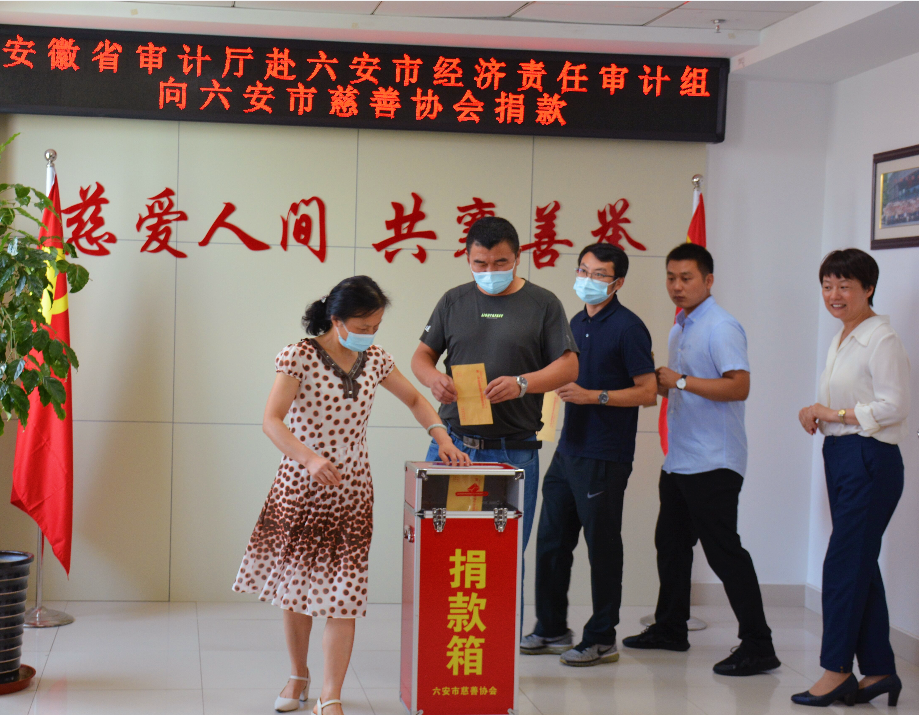 2022年8月2日上午,安徽省审计厅赴六安市经济责任审计组、六安市审计局联合开展献爱心捐赠活动在六安市慈善协会会议室举行。活动现场,安徽省审计厅赴六安市经济责任审计组30余名同志和市审计局领导,慷慨解囊,奉献爱心。市慈善协会会长李乔和市审计局局长朱晓琳参加了捐赠活动。