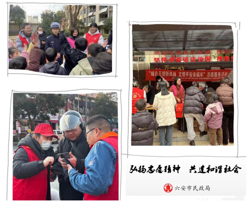 倡导保护环境 过绿色新年。结合绿色低碳宣传,通过发放环境保护宣传资料、张贴宣传海报等方式,提升群众环保意识。市委史志室联合六安市公安局交通警察支队二大队组织志愿者开展“我们的节日·春节”暨“绿色无烟新风尚"活动,国网六安市城郊供电公司志愿服务队开展“e”起节约用电“碳”寻美好生活专项推广活动,引导大家度过一个文明节俭、绿色环保的春节。