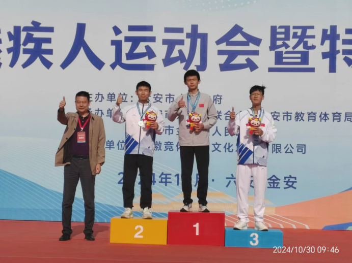 每一份荣誉都凝结着无数的汗水和付出。刘宏享虽是一名聋哑孩子,但他勇于接受挑战。自8月以来,刘宏享紧跟赛事安排,专门前往六安市体育运动学校、六安市体育中心参与集训;回院后,每日坚持在院内操场跑步训练,耐心倾听老师提出的意见并加以改正。经过两个多月的不懈努力,如今的他终于站在了领奖台上!