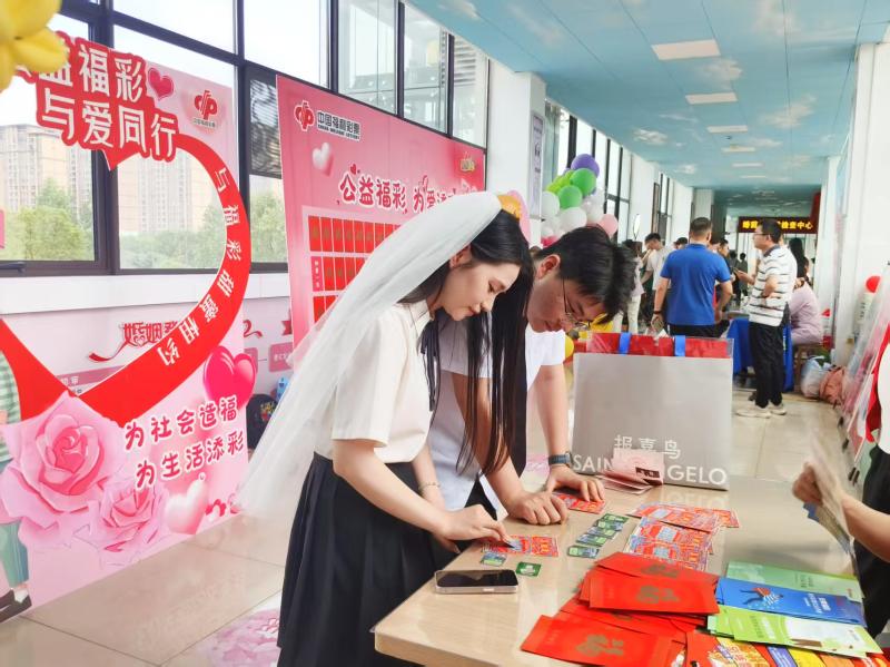 在婚登处入口长廊,图文并茂的公益展板吸引了新人驻足。展板上生动展示了责任福彩与福彩公益金的作用,让新人们感受福利彩票的社会责任担当,深化公众对福彩公益属性的认知。活动现场福新店的网点征召宣传页面,为有创业想法的新人们提供了宝贵的加盟机会,也为他们小家庭的未来规划增添了更多可能。