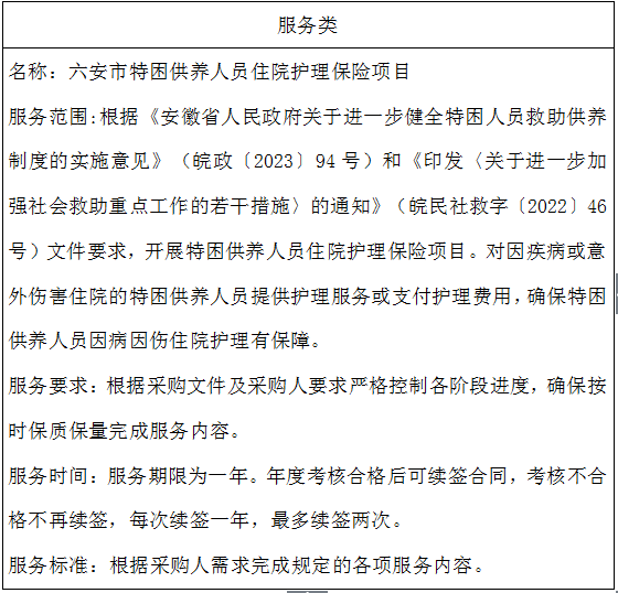二、项目名称:六安市特困供养人员住院护理保险项目
