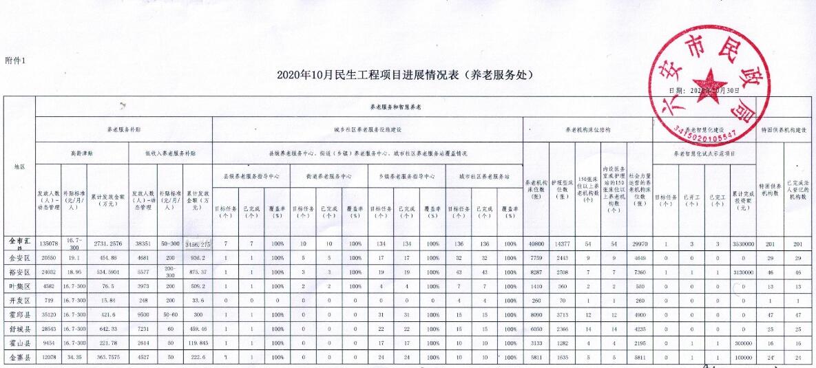 六安市2020年10月社会养老服务体系和养老智慧化建设进度情况表