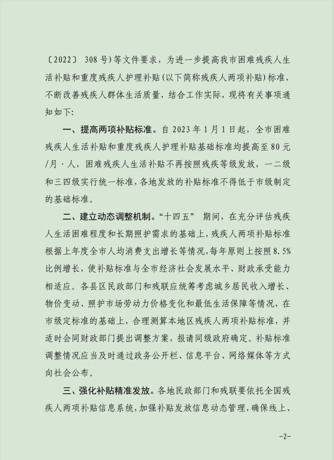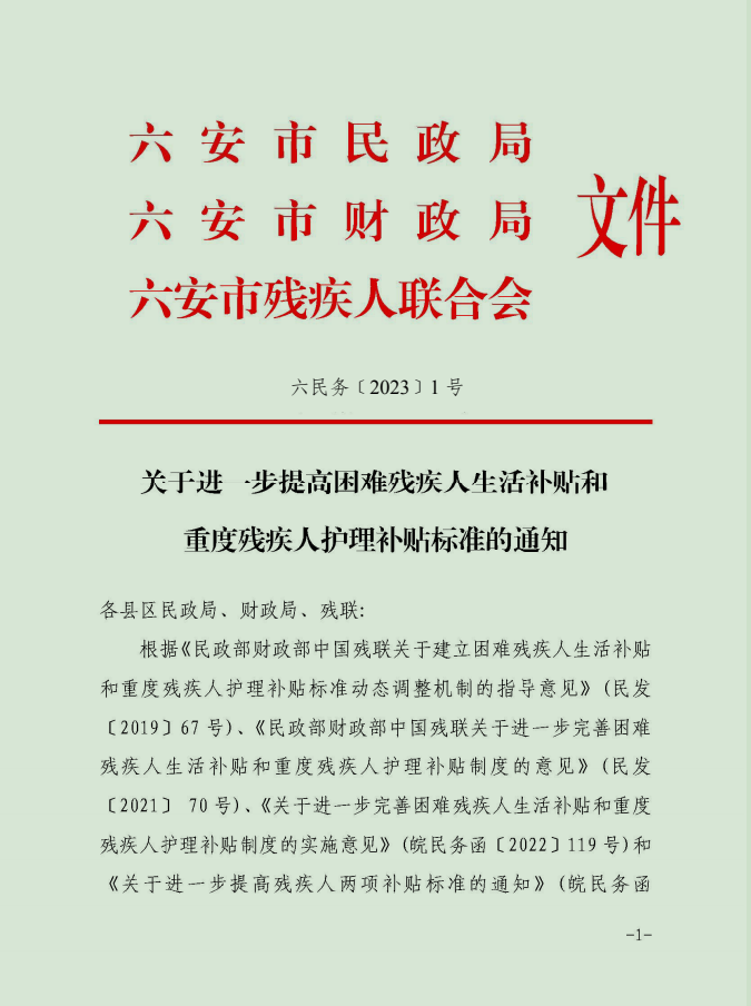 关于进一步提高困难残疾人生活补贴和重度残疾人护理补贴标准的通知