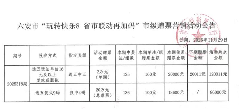 六安市“玩转快乐8 省市联动再加码”市级赠票营销活动公告