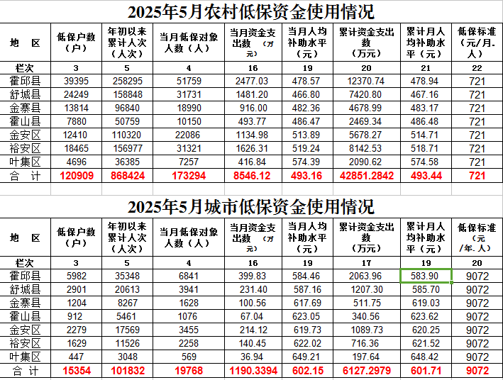 六安市2025年5月份城乡低保资金与标准情况统计表