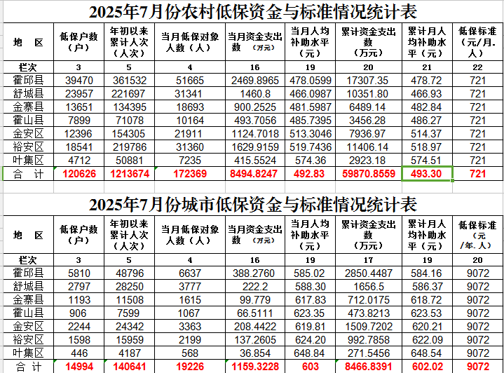 六安市2025年7月份城乡低保资金与标准情况统计表