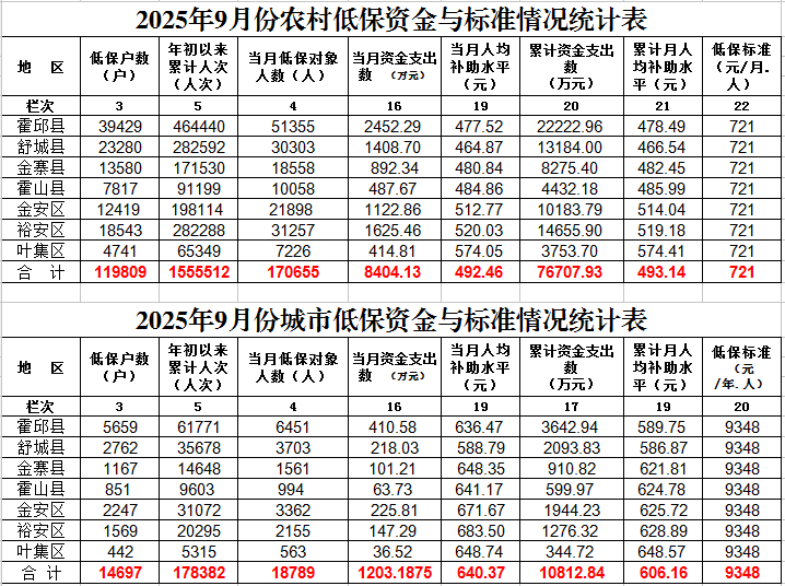 六安市2025年9月份城乡低保资金与标准情况统计表