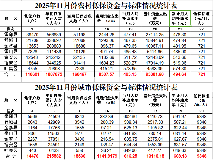 六安市2025年11月份城乡低保资金与标准情况统计表