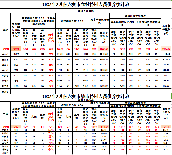六安市2025年5月份特困供养资金使用情况统计表