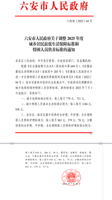 六安市人民政府关于调整2025年度城乡居民最低生活保障标准和特困人员供养标准的通知