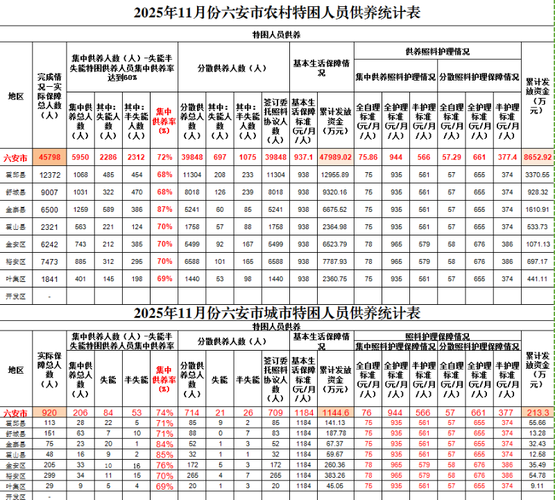 六安市2025年11月份城乡特困供养资金使用情况统计表