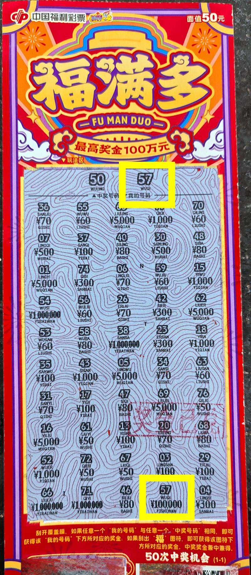 当天下午四时许,夫妻俩在商场购物休闲时,被福彩网点醒目的即开票展示柜吸引。抱着试试手气的心态,年轻的丈夫挑选了三张刮刮乐彩票。当他刮到最后一张50元面值的“福满多”时,小心翼翼地逐行刮开覆盖膜。就在即将放弃时,覆盖膜内最后一行的倒数第二个数字“57”与“中奖号码57”完美匹配,更令人惊喜的是下方赫然显示着“¥100,000”的中奖金额!