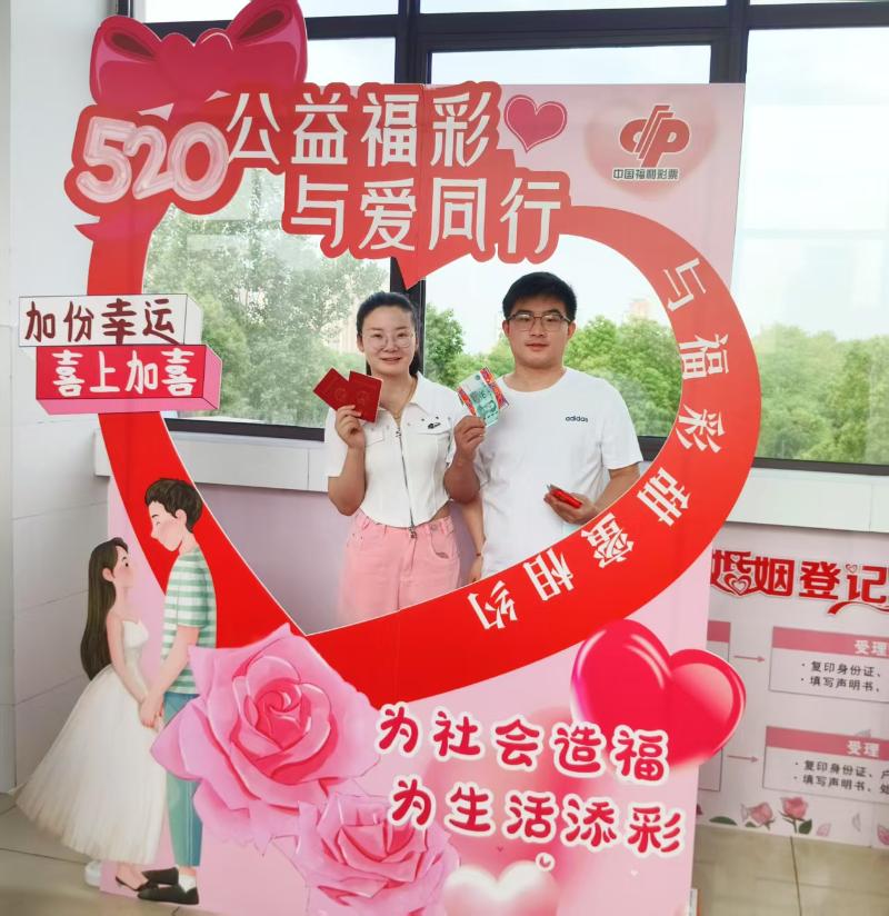 爱心造型的福彩主题拍照墙前,新人们手持福袋中的“喜相逢”刮刮乐和结婚证,甜蜜合影留念。灿烂的笑容、幸福的模样,在镜头下定格成一幅幅美好的画面,为这个特别的领证日增添了满满的仪式感,也让福彩元素与新人们的幸福时刻紧紧相连。