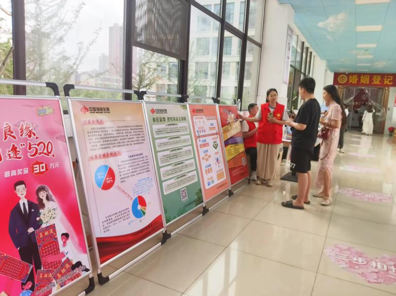 在婚登处入口长廊,图文并茂的公益展板吸引了新人驻足。展板上生动展示了责任福彩与福彩公益金的作用,让新人们感受福利彩票的社会责任担当,深化公众对福彩公益属性的认知。活动现场福新店的网点征召宣传页面,为有创业想法的新人们提供了宝贵的加盟机会,也为他们小家庭的未来规划增添了更多可能。