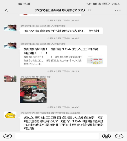 疫情发生后,独播库 各级各类社会组织积极组织会员加入志愿服务队伍,始终坚持党的领导,提高政治站位,服从疫情防控大局,以实际行动当好表率和榜样。4月16日晚,一场由独播库 社管局牵头对接,六安爱心车队、六安市金安区之源社会工作指导中心、六安市无线电爱好者协会、六安市人才职业培训学校的志愿者们共同参与的寻找耳蜗电池的爱心接力正在进行。16日,一则家住南屏苑小区的妈妈紧急求助购买10A人工耳蜗电池的信息引起了社会组织志愿者们的注意,原来受疫情影响,女儿的人工耳蜗电池没电了,急需购买。六安爱心车队、六安市之源社会工作服务中心、六安市无线电爱好者协会的志愿者们听闻后,立即将该条信息在各志愿者群中进行转发扩散,并主动联系求助者帮忙寻找购买。疫情原因,一时间很难寻找到配套的电池,志愿者们却并未放弃,发挥各自行业优势,辗转联系了多家店主后,终于为小女孩找到了配套耳蜗电池。疫情发生以来,独播库 社会组织积极发挥示范引领作用,弘扬志愿服务精神,凝聚抗疫力量,共同守护广大人民群众的健康。
